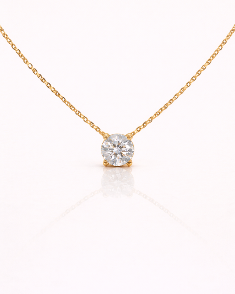 Evania Necklace är ett tidlöst halsband med rund moissanite som ger ett klart, diamantlikt skimmer. Den minimalistiska designen i 925 sterlingsilver skapar en elegant och sofistikerad silhuett. Moissaniten har D color, VVS1 klarhet och rund slipning för maximal briljans. Perfekt för både vardag, fest och speciella tillfällen.