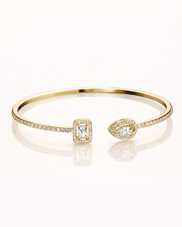 Orelle Cuff är ett modernt cuff-armband med geometrisk design och gnistrande kubisk zirkonia. Den eleganta guldfinishen ger ett sofistikerat uttryck som lyfter både vardag och kvällslooks. Ett stilrent statement med trendig känsla.